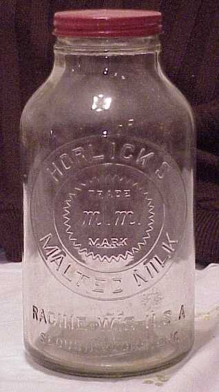 Horlick malted milk. This large display / dispenser jar is in very good shape. Top is most likely NOT original but still displays well. Needs a good cleaning. |